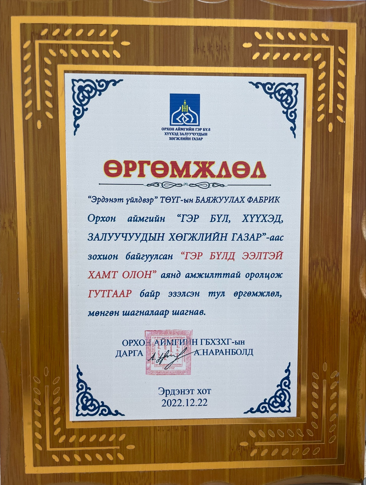 Орхон аймгийн Гэр бүл хүүхэд залуучуудын хөгжлийн газраас зохион байгуулсан “Гэр бүлд ээлтэй хамт олон” аянд Баяжуулах үйлдвэрийн хамт олон оролцож гуравдугаар байр эзлэн өргөмжлөл, мөнгөн шагналын эзэд болжээ.